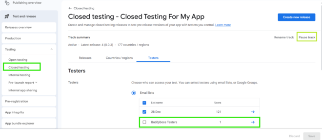 - In Play Console, go to Testing > Closed Testing and select the relevant track.